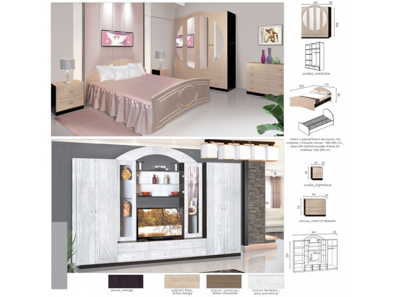 Вітальня "Омега" — це вражаюче доповнення вашого інтер'єру. Каркас вітальні виконаний у кольорі венге магія, а фасад з МДФ у відтінку штрокс шоколад надає сучасного вигляду. Особливістю цієї вітальні є ефектний малюнок на лицьових панелях, фурнітура з хромованого металу та оригінальний декоративний елемент у вигляді півмісяця.